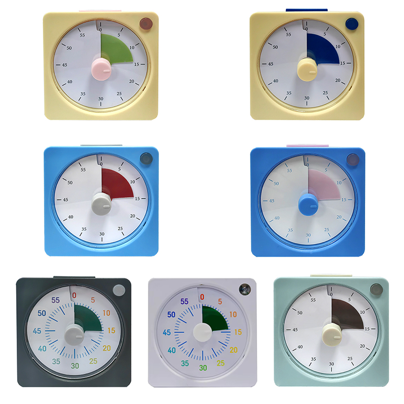 This timer features a visual design with a clear dial marked from 0 to 60 minutes, allowing users to easily set and track time at a glance. The colorful sectors on the dial, available in various hues like green, blue, red, and more (as seen in the range of color options), make the passage of time highly intuitive, which is especially helpful for kids to understand and manage their study intervals.