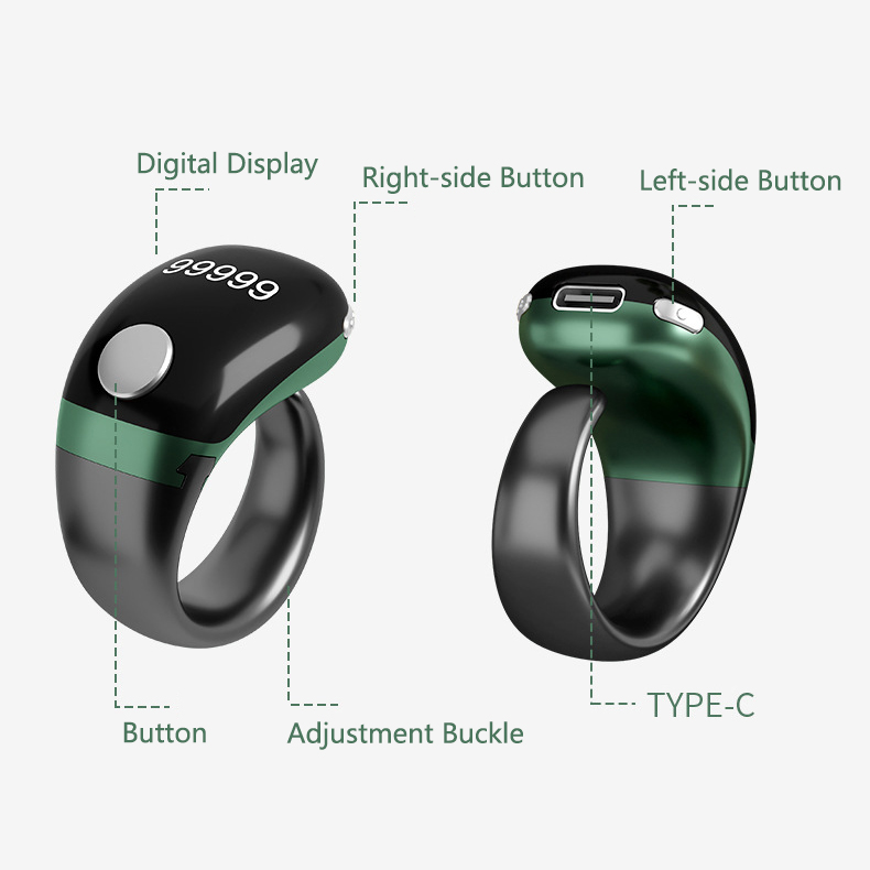 This portable electronic finger counter is an ingenious multifunctional device integrated with precise counting and intelligent time reminder functions, crafted to satisfy diverse portable tally demands in daily life, meditation, prayer recording, and manual quantity statistics. Available in four exquisite button-style color variants, namely black, rose gold, green and gray, it perfectly combines practical performance with delicate appearance, bringing a handy and efficient counting experience for every user.
