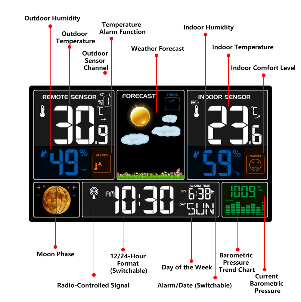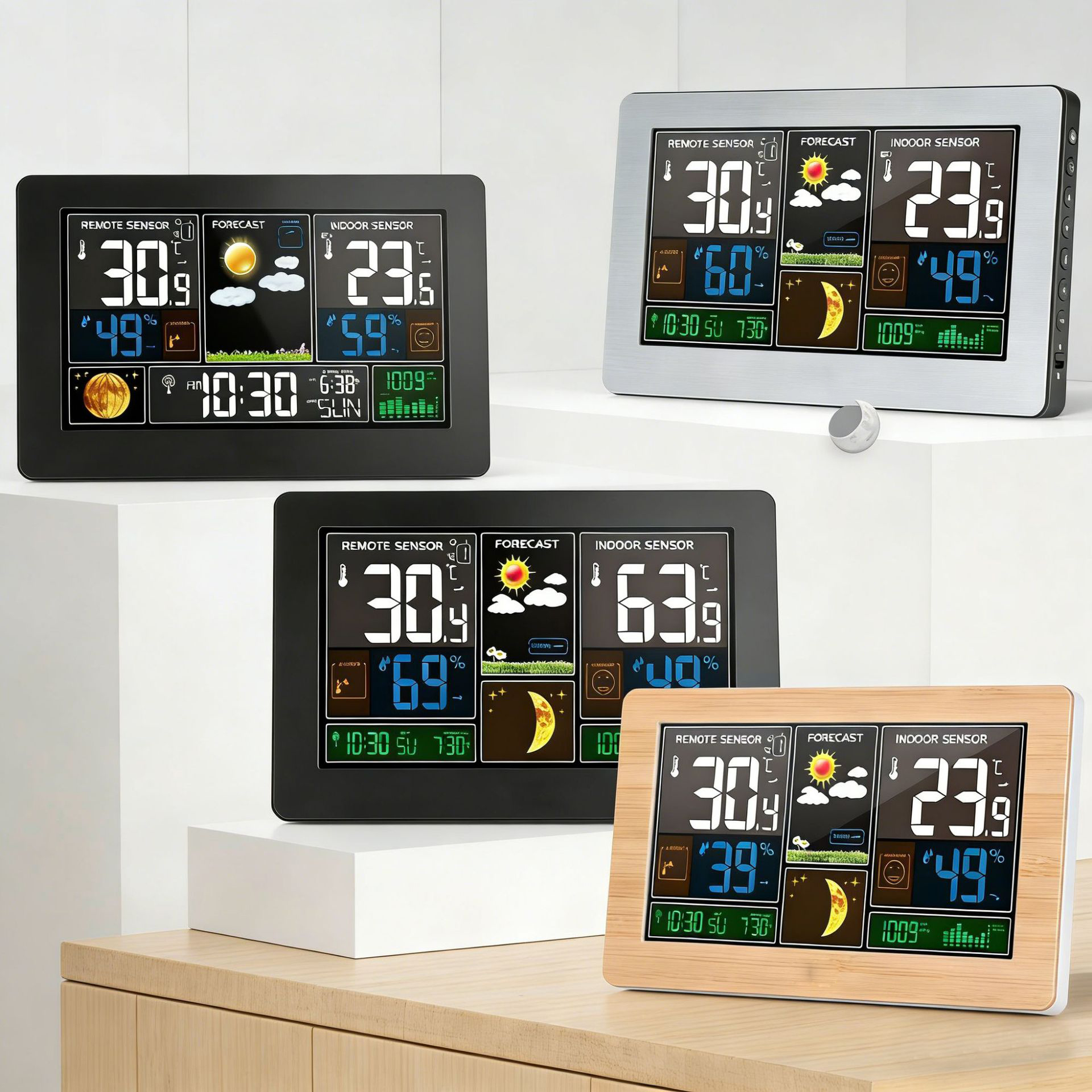 This all-in-one weather station is your complete home environmental monitor and timekeeping companion, designed to keep you informed, organized, and prepared for every day.