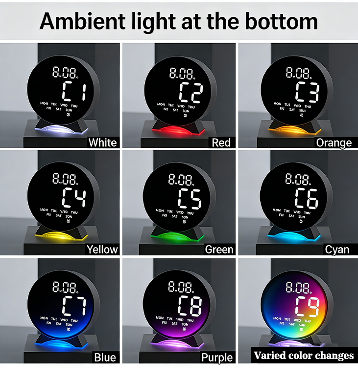 A standout highlight is its vibrant bottom ambient light, which cycles through a spectrum of colors to create a cozy, relaxing atmosphere in your room. Whether you’re winding down with a book, hosting a small gathering, or simply adding a subtle decorative touch, this feature transforms the clock from a functional device into a stylish accent piece.