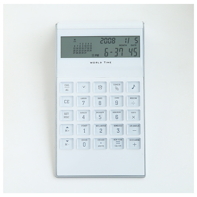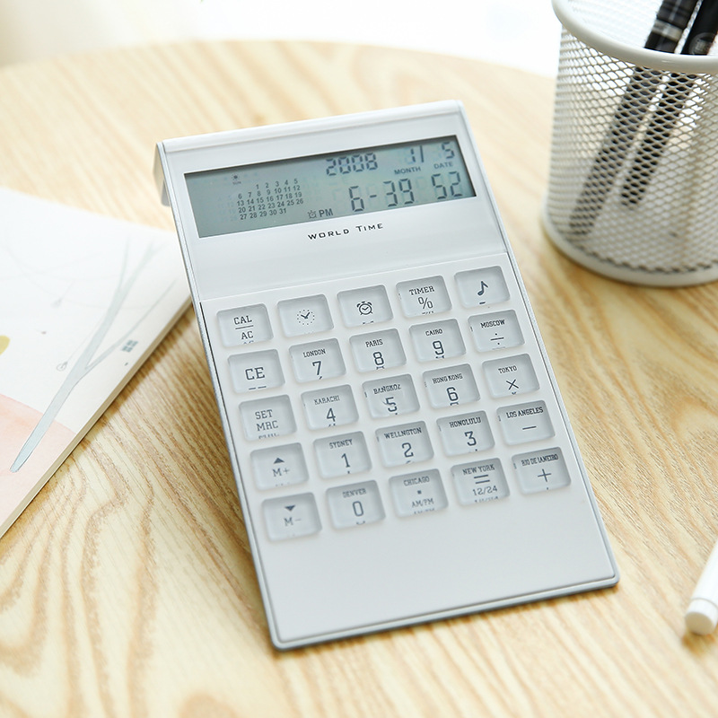Home » Products » Calculator » Minimalist World Time Perpetual Calendar Plastic Calculator 10 Digit Crystal Button Calculator Battery Power Desktop Calculator