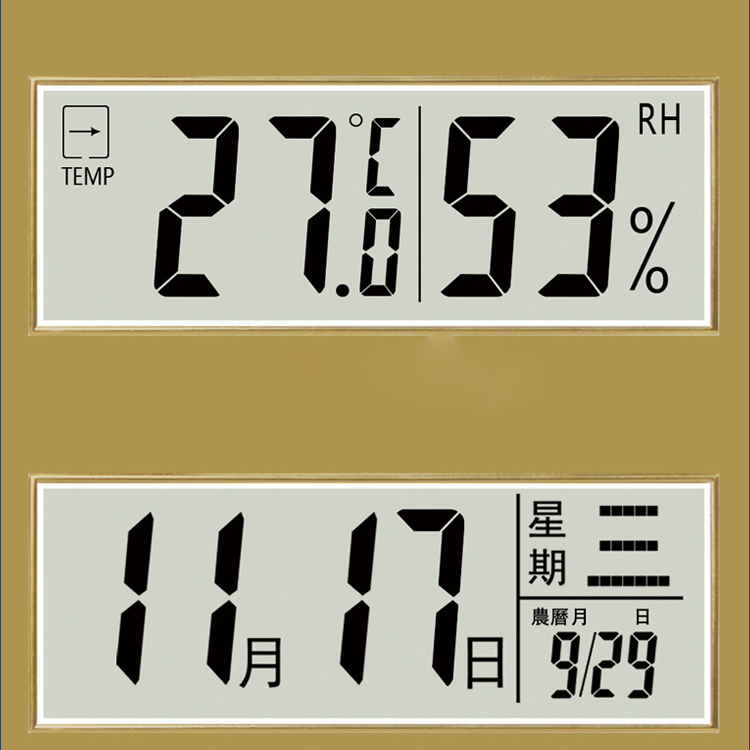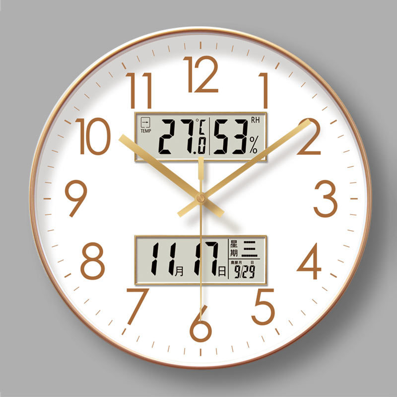 The clock’s sleek, round design features a clean white dial with bold, easy-to-read golden numerals and hands, ensuring clear visibility from across the room. What sets it apart is its dual digital display panels: the upper screen shows real-time indoor temperature and humidity, while the lower panel displays the full calendar, including Gregorian date, lunar calendar, day of the week, and month. This all-in-one functionality makes it more than just a timepiece—it’s a daily helper that keeps you informed about both time and your home environment.